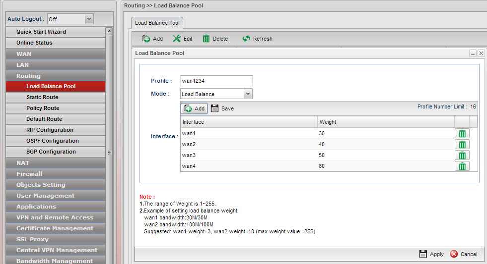 Để Vigor3900 có thể chạy Load Balancing chinh xác, cần khai báo thông số Weight trên mỗi Wan. Giả sử băng thông trên từng Wan lần lượt Wan 1, Wan 2, Wan 3, Wan 4 : 30Mbps, 40Mps, 50 Mbps, 60Mbps.