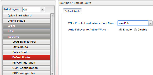 Vào Routing >> Default Route chọn wan1234, sau đó Apply.