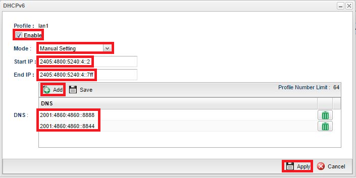 • Start IPEnd IP: Bạn chọn IPv6 đầu và cuối trong khoảng bạn muốn cấp. Có thể dùng các công cụ hỗ trợ như trang "http://www.gestioip.net/cgi-bin/subnet_calculator.cgi" để tính toán và xác định khoảng IPv6 muốn cấp.