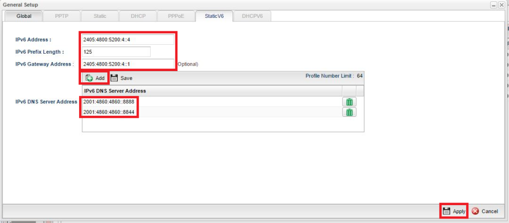 • Nhấn nút Add ở mục IPv6 DNS Server Address và điền vào địa chỉ IPv6 của DNS Server bạn muốn dùng. Ví dụ IPv6 của DNS Google là: