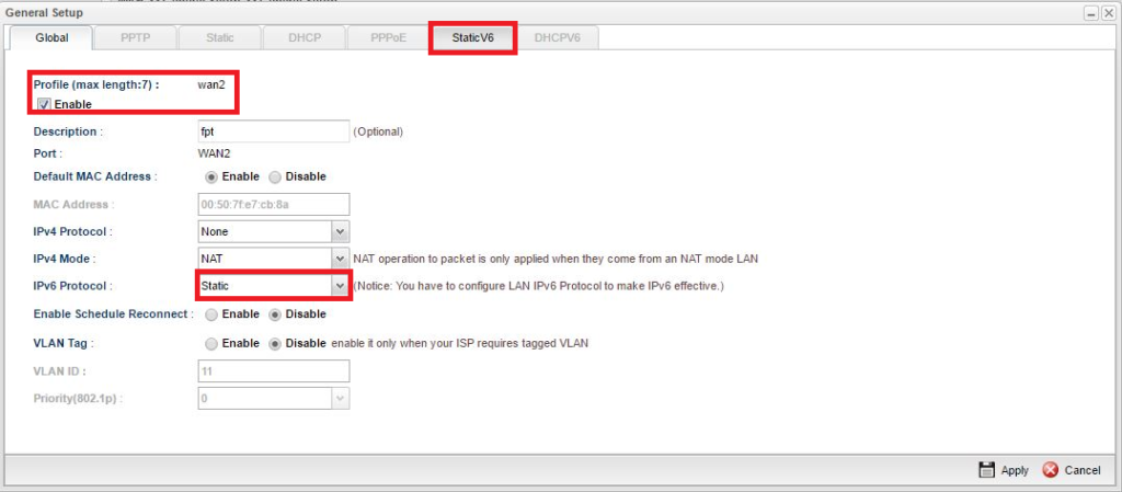 • Điền vào các thông số của cổng WAN mà nhà mạng đã cung cấp cho bạn vào các mục tương ứng: IPv6 Address, IPv6 Prefix Length, IPv6 Gateway Address.
