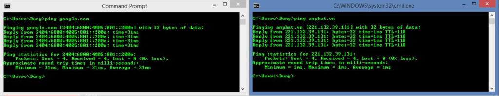 • Tiếp theo đó trên máy tính bạn chạy tiếp lệnh PING đến các website dùng IPv4IPv6 xem có PING thành công không. Nếu PING được là bạn đã cấu hình thanh công.