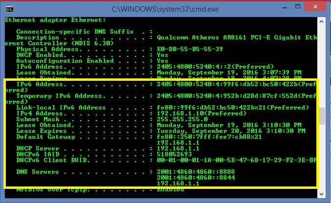 • Trên máy tính bạn mở công cụ CMD và chạy dòng lệnh "ipconfig /all", và kiểm tra xem có các thông số IPv4IPv6 chưa?