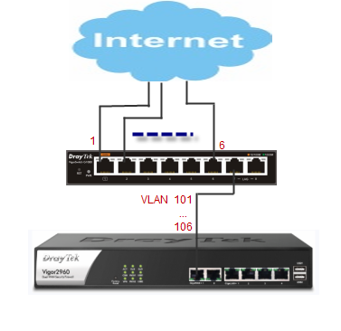 • Nối 6 đường truyền Internet vào các Port từ 1-6 trên VigorswitchG1080
