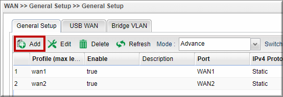 Vào WAN >> General Setup, nhấn “Add” để tạo thêm WAN mới