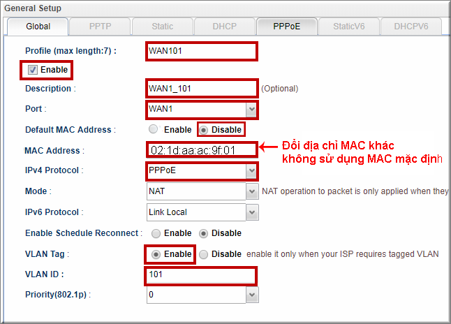 • Profile                 : Đặt tên WAN (ví dụ WAN100)