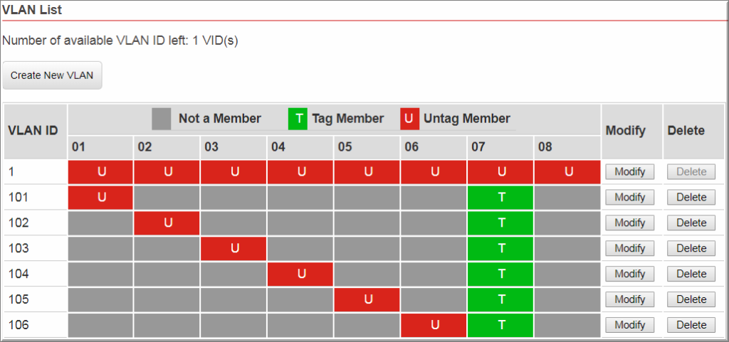 • Check port và thuộc tính tương ứng ( VLAN101 gồm Untag port 1 và tag port 7), với :