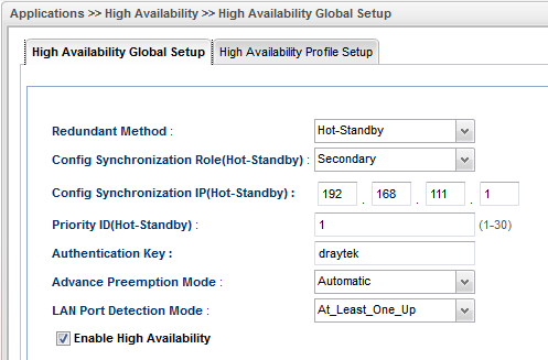 Authentication Key: draytek (đây là mật khẩu chứng thực giữa 2 router chạy HA phải trùng với key đã khai báo lúc nãy trên Primary)