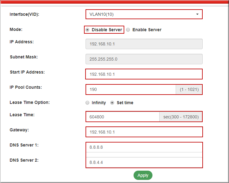 - VLAN10, VLAN server và camera, lớp mạng 192.168.10.1/24, DHCP disable