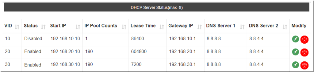- Thực hiện tương tự cho VLAN 20, VLAN 30, với DHCP Enable