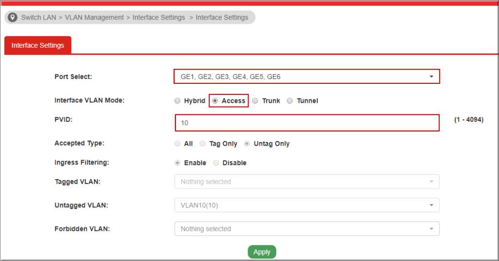 Vào Switch VLAN>> VLAN Management>> Interface Settings