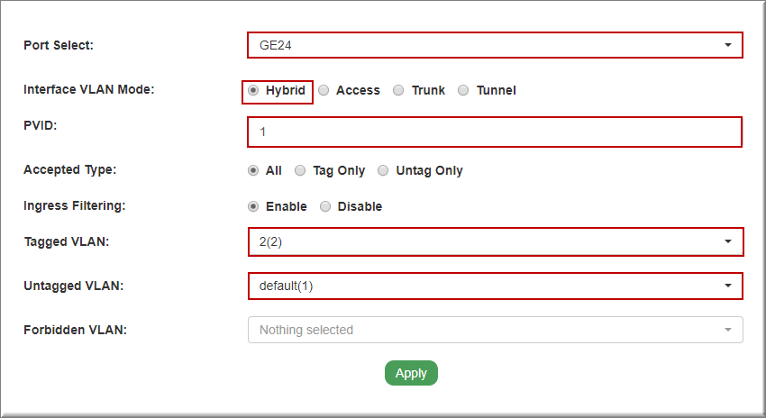 Cấu hình port 24 Hybrid (untag VLAN1- Tag VLAN2Port Select: Chọn GE24