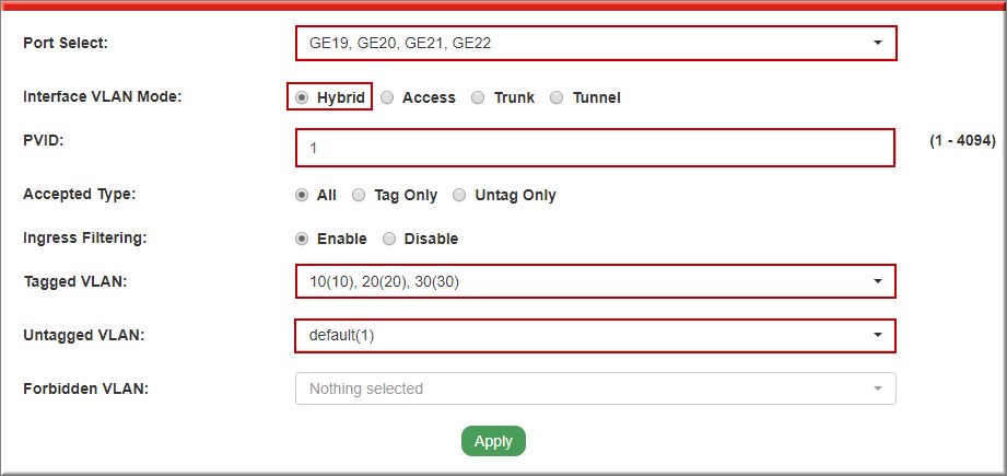 Cấu hình port GE19/20/21/22 Hybrid VLAN 1, tagged tất cả các VLAN10,20,30