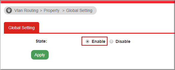 Vào VLAN Routing >> Property, chọn Enable >> nhấn Apply