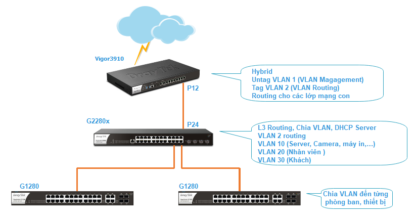 VigorSwitch G2280x làm Switch trung tâm, nhận internet từ Vigor3910, sau đó chia hệ thống thành 3 nhóm với 3 lớp mạng như sau:
