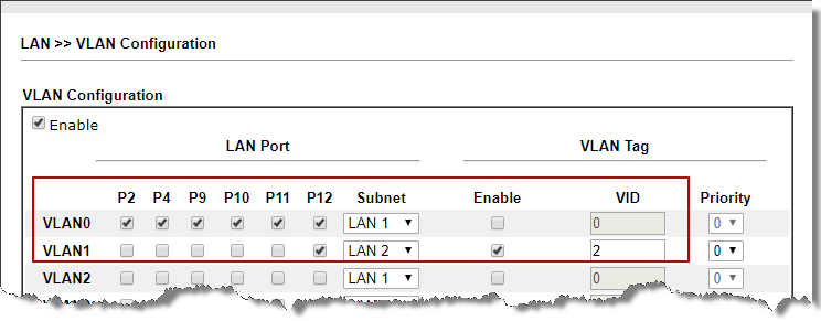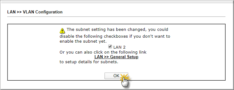 Mặc định LAN 1 và LAN 2 của Vigor3910 sau khi kích hoạt VLAN đã có lớp mạng 192.168.1.1/24 và 192.168.2.1/24, nên không cần cấu hình.