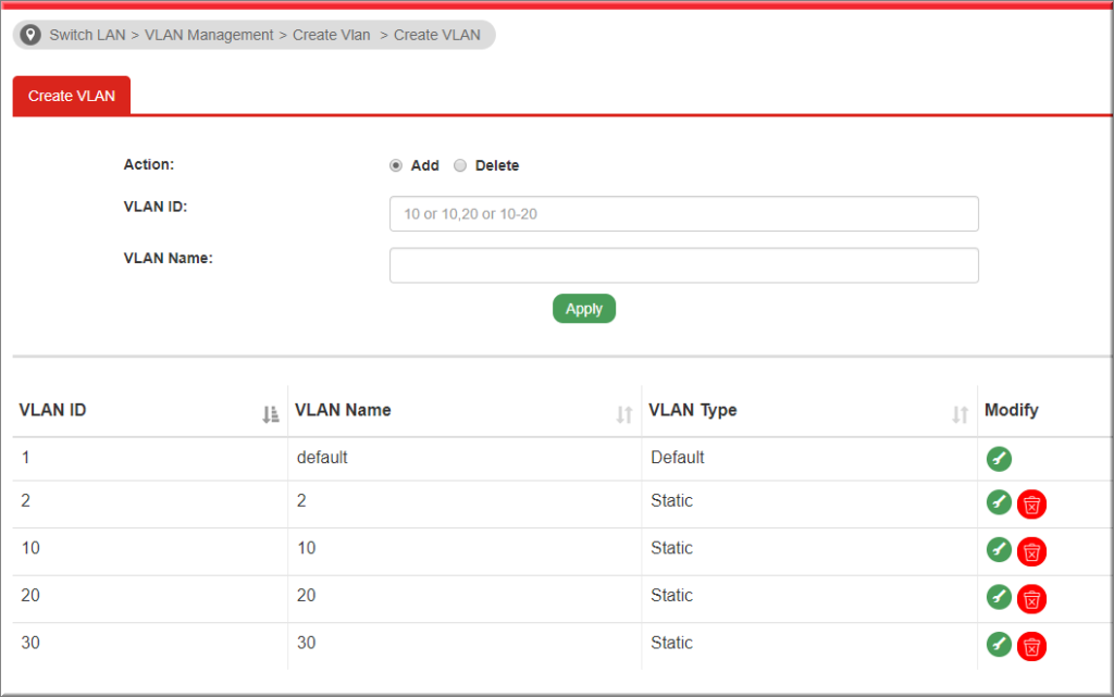 Vào Switch LAN >> VLAN Management >> Create VLAN
