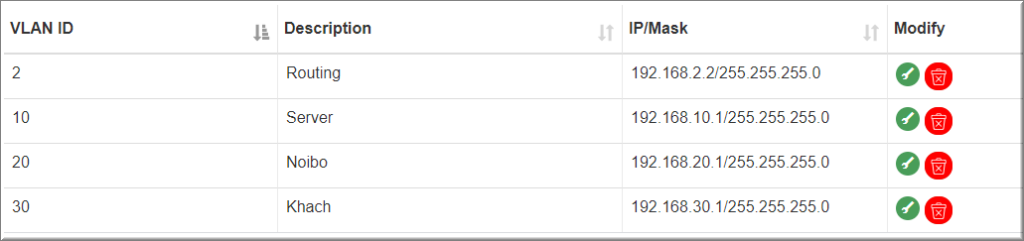 - Thực hiện tương tự cho các VLAN còn lại, Ta có danh sách các VLAN như sau