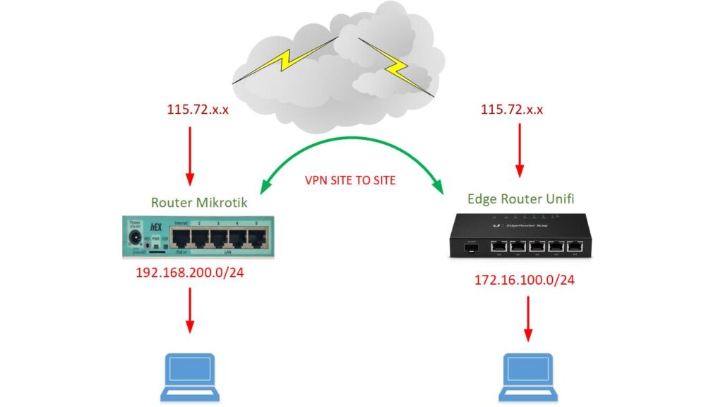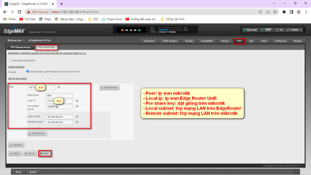 - Nội dung cấu hình chính: xây dựng kết nối VPN site to site trên Router Mikrotik và router Unifi thông qua Tunnel Ipsec.
