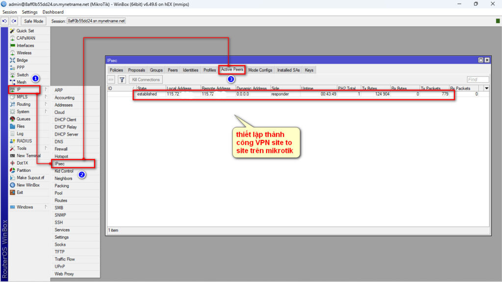 - Ip –> ipsec –>peers để kiểm tra trạng thái
