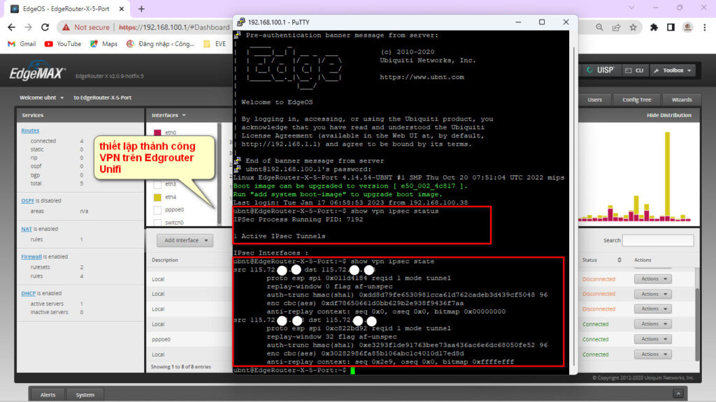 - Mình dung Puty để SSH đến Edg Router Unifi kiểm tra kết quả bằng lệnh show vpn ipsec status và show vpn ipsec state