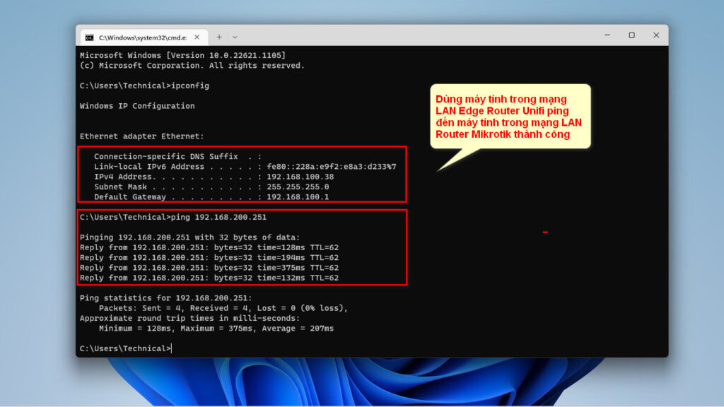 Client ở router Unifi đã ping thành công đến client ở router mikrotik