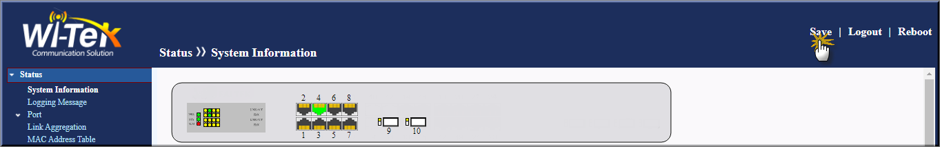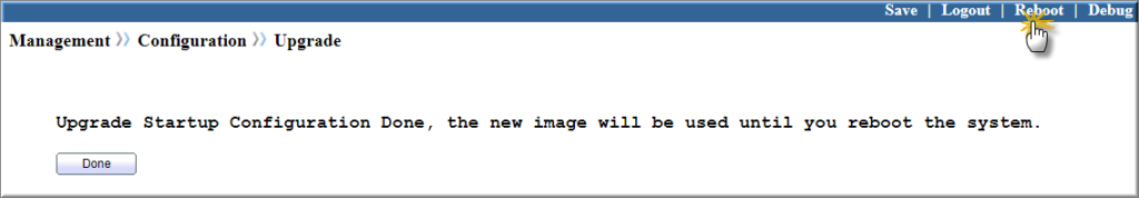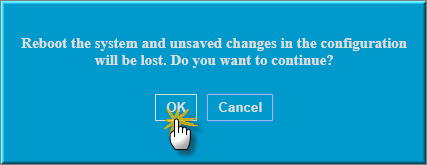 - Nhận được thông báo thiết bị vẫn hoạt động với cấu hình đang chạy “Running-Config”. Cần phải reboot để việc Restore có tác dụng, tại góc trên- bên phải web quản lý, nhấn “Reboot”