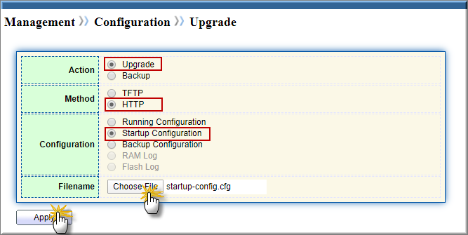 - Filename: nhấn “Choose File”, và chọn file cấu hình đã backup trước đó