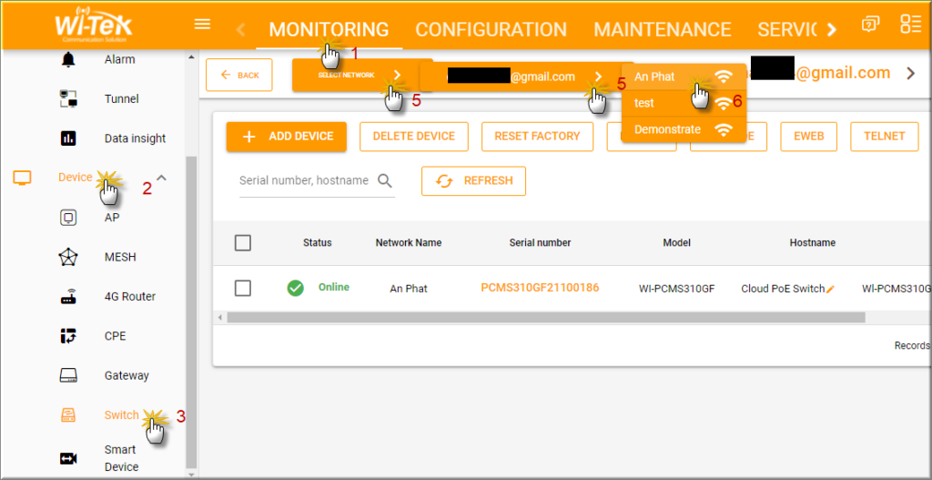 - Vào MONITORING >> Devive >> Switch >> chọn Network của bạn