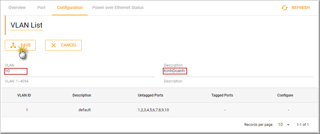 - VLAN: điền VLAN cần tạo (ví dụ VLAN10)