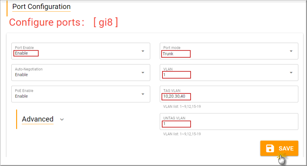 - Tag VLAN: điền tất cả các VLAN, các VLAN cách nhau bởi dấu “,”