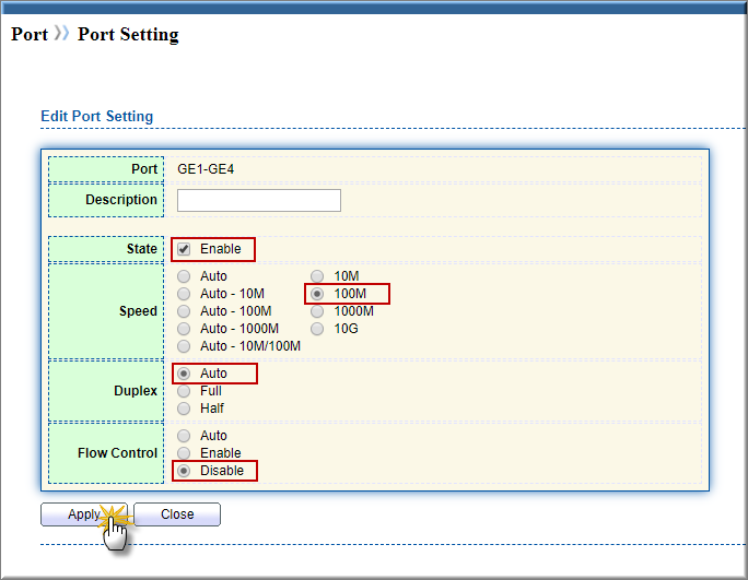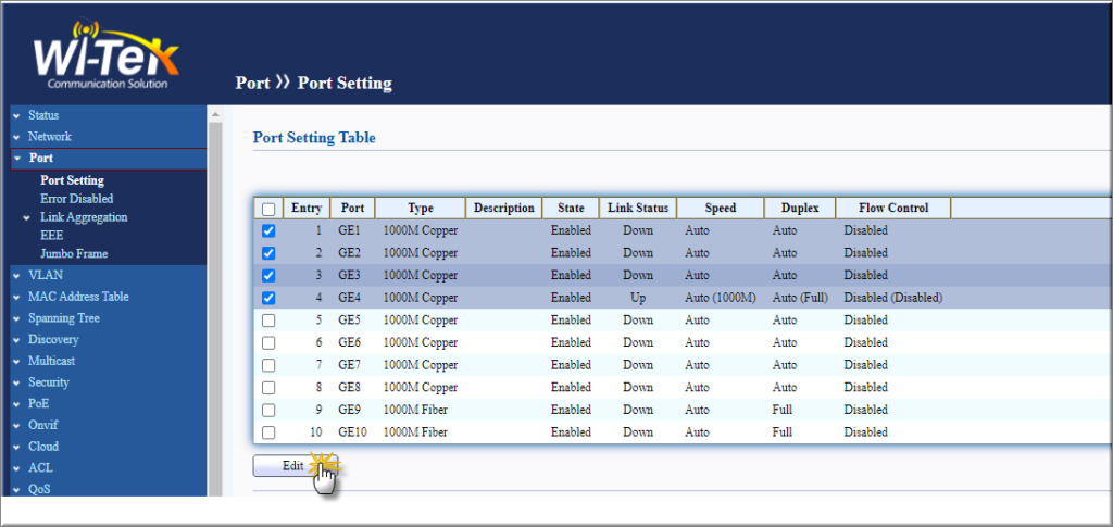 - Vào Port >> Port Settings, check chọn các port cần thay đổi, có thể chọn 1 hoặc nhiều port (ví dụ các port GE1/2/3/4) >> nhấn Edit