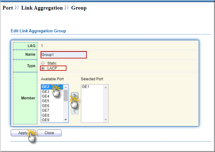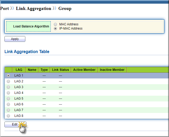 - Tại bảng Link Aggregation Table,chọn Group LAG1, nhấn Edit