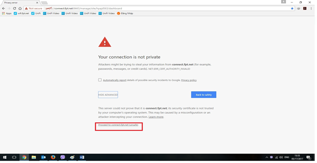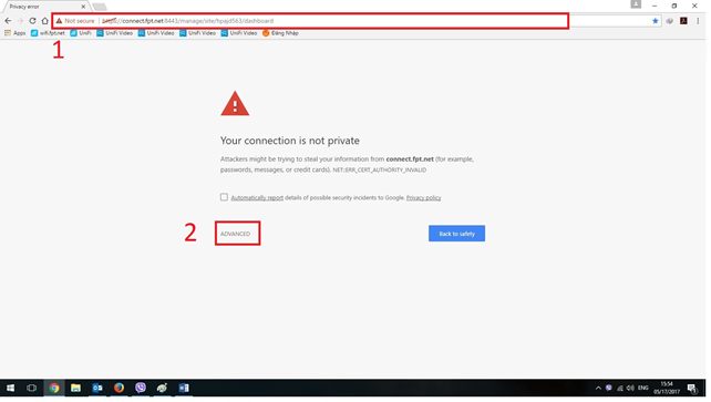 Sử dụng trình duyệt web Chrome nhập vào địa chỉ : https://connect.fpt.net:8443 -> Chọn “ADVANCED” -> chọn “Proceed to connect.fpt.net(unsafe)” -> Đăng nhập vào controller bằng email đã kích hoạt.