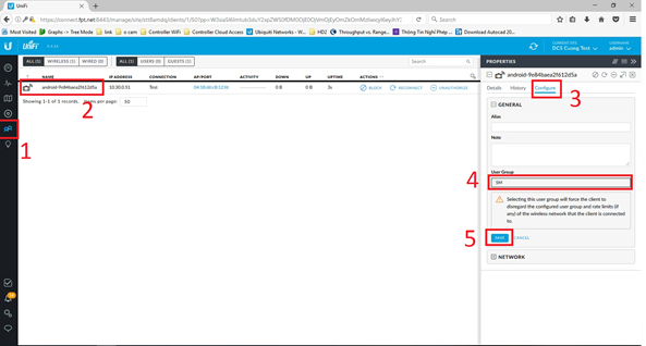 - “CLIENTS” / Chọn thiết bị cần giới hạn băng thông / Tại cửa sổ mới chọn “Configure” / Thực hiện gán băng thông trông ô “user group”