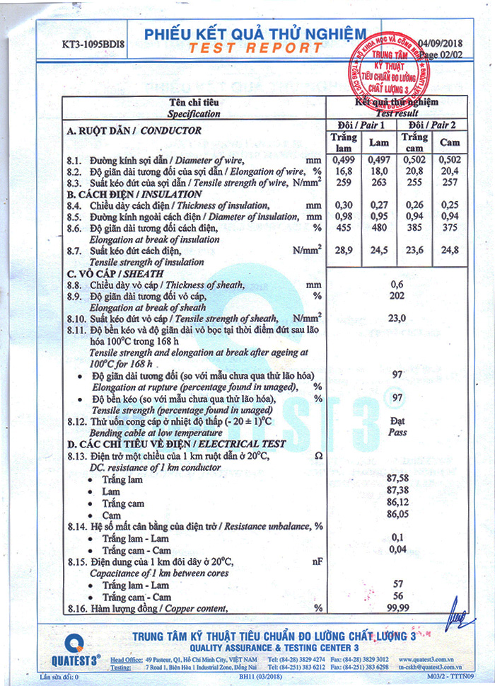Dây Cáp mạng Cat5e VSCOM UTP 4 cặp xoắn đôi, lõi đồng nguyên chất, vỏ PVC ( cuộn 305M) Cáp mạng VSCOM là sản phẩm “Made in Viet Nam” được sản phẩm sản xuất tiêu chuẩn chất lượng ISO 9001. Các model của VSCOM đều được kiểm định có lõi đồng nguyên chất và đạt chất lượng tiêu chuẩn tại QUATEST 3 đảm bảo chất lượng, đầy đủ giấy tờ kiểm định cho mọi công trình. Dây Cáp mạng Cat5e VSCOM có đường kính 24AWG 0.52mm. Mỗi dây dẫn là đồng nguyên chất, có tiết diện ngang hình tròn. Ngoài ra cáp mạng VSCOM Cat5e có 4 cặp xoắn đôi với nhau để chống phát xạ nhiễu điện từ. Cáp mạng VSCOM Cat5e UTP, lõi đồng nguyên chất Dây dẫn cáp mạng VSCOM Cat5e được kéo rút một cách trơn, nhẵn, có chất lượng và đường kính đồng đều, không có bất kỳ khuyết tật hay mối nối nào trên suốt chiều dài của sợi dây, được sử dụng nhiều trong hệ thống mạng LAN trong nhà. Dây cáp VSCOM có độ bền cơ học cao, chịu được lực kéo 5N, suy hao truyền dẫn ở tần số 100Mhz, được làm bằng được làm bằng nhựa PVC chống cháy và chống ô nhiễm môi trường thích hợp dùng trong nhà, hộ gia đình, giá thành rẻ nhưng vẫn đảm bảo chất lượng. Dây Cáp mạng Cat5e VSCOM UTP có lõi đồng nguyên chất với tiết diện đạt chuẩn 0.5mm (Dây cáp mạng Cat5e PVC lõi đồng nguyên chất) D-ây dù trợ lực bên trong dây cáp mạng VSCOM giúp tăng độ bền và khả năng chịu tải, đạt tiêu chuẩn chất lượng ISO 9001, Quatest 3 Cáp mạng VSCOM Cat5e UTP, lõi đồng nguyên chất Cáp mạng VSCOM lõi đồng nguyên chất 100% không bị gãy khi đốt nóng CÁP MẠNG VSCOM Made in Viet Nam – CÁP CỦA CHẤT LƯỢNG, ĐẦY ĐỦ CÁC GIẤY TỜ CHO DỰ ÁN – Tất cả sản phẩm lõi đồng nguyên chất 100% – Sản phẩm sản xuất tiêu chuẩn chất lượng ISO 9001 – Tất cả các model được kiểm định đạt chất lượng tiêu chuẩn tại QUATEST 3 – Sản phẩm đạt tiêu chuẩn chất lượng Việt Nam Chứng nhận chất lượng cáp mạng VSCOM CAT5E PVC Giấy kiểm định chất lượng cáp mạng VSCOM Cat5e UTP vỏ PVC Video test Dây Cáp mạng Cat5e VSCOM UTP chạy xa 275M cấp nguồn qua Switch poe Hikvision vẫn chạy tốt không bị giật hình hay delay tin hiệu ( Video test cáp mạng VSCOM cat 5 UTP đi xa 275m vẫn chạy tốt ) => Chi tiết So sánh khả năng truyền dẫn tín hiệu giữa cáp mạng VSCOM và COMMSCOPE (AMP)