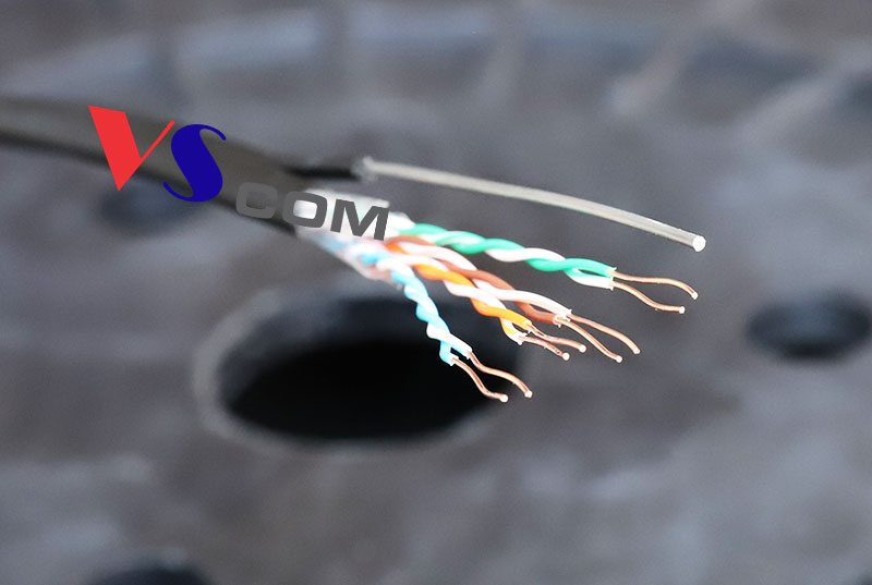 Dây cáp mạng ngoài trời outdoor có sợi cáp chịu lực VSCOM Cat5e PE SS UTP có đường kính 24AWG 0.52mm. Mỗi dây dẫn là đồng nguyên chất, có tiết diện ngang hình tròn. Ngoài ra cáp mạng VSCOM Cat5e PE SS có 4 cặp xoắn đôi với nhau để chống phát xạ nhiễu điện từ.