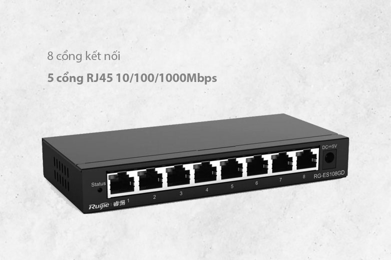 Thiết bị chuyển mạch 8 cổng Switch RUIJIE RG-ES108GD được trang bị bao gồm 8 cổng kết nối cùng với 5 cổng sử dụng cáp RJ45 có tốc độ 10/100/1000Mbps. Từ đó, cho phép những máy tính gần nhau có thể truy cập được internet và kết nối dữ liệu một cách nhanh chóng. Thêm vào đó, thiết bị còn có tính năng giúp tự động đàm phán và hỗ trợ được Auto MDI/MDIX giúp người dùng có thể quản trị được hệ thống mạng linh hoạt.